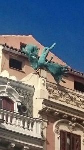 We show you this week the statue which is right in front of the school of Art La Palma, in the street of the same name, in the district of Malasaña. The dynanism of this sculpture attracts the eye. It was unfortunately several times vandalized, but always restored and put back in its place, for the enjoyment of passers-by. Have a good week: